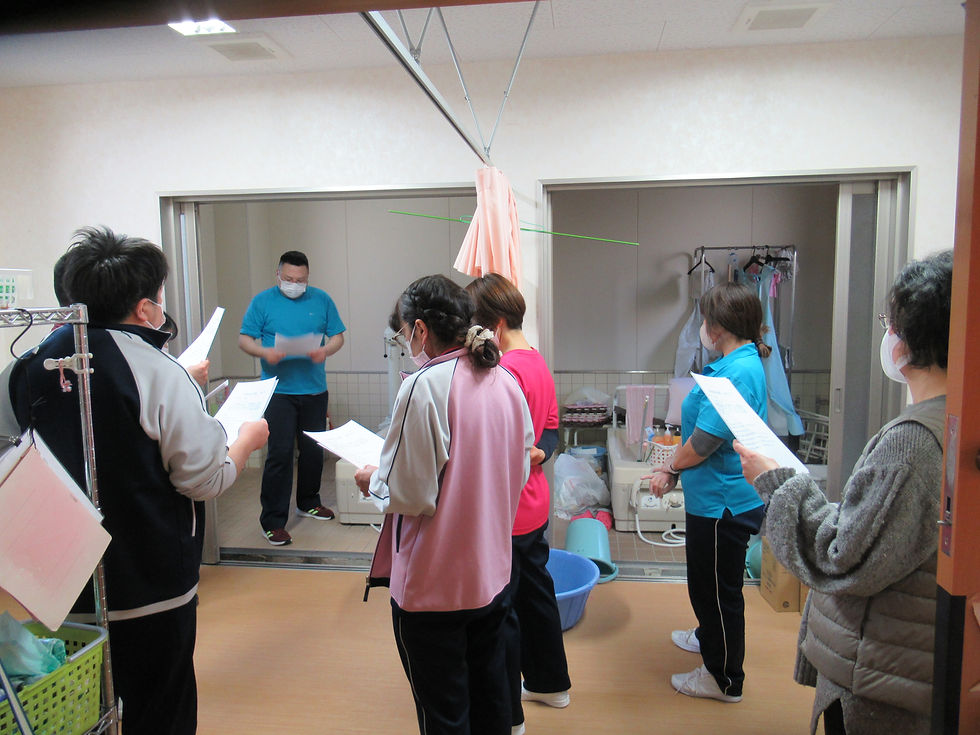 介護施設や病院等で多いと言われている事故が入浴です。入浴事故では床が濡れていて転んでしまう、湯船やシャワーの温度が熱くて火傷をしてしまう、絶対に起きてはならないのが湯船でおぼれてしまうことです。テレビやSNSなどで見られたり聞いたことがあるかもしれませんが職員の不注意で大切なご家族の命が奪われてしまった等の話を聞かれたことのある方も多いと思います。私たちの施設では事故を起こさないためにも定期的に研修を行っています。研修の一部を紹介します。